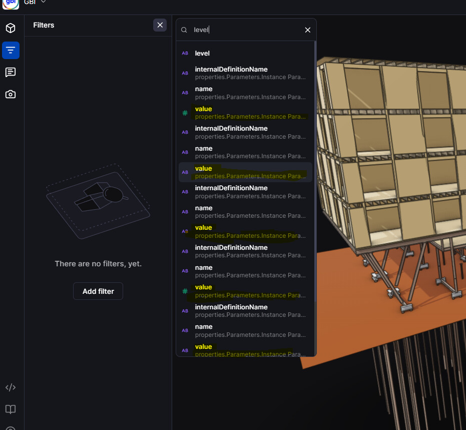When I want to add a filter based on the Level parameter, several options appear. Since the paths are truncated, I need to test each one manually to figure out which one is correct.